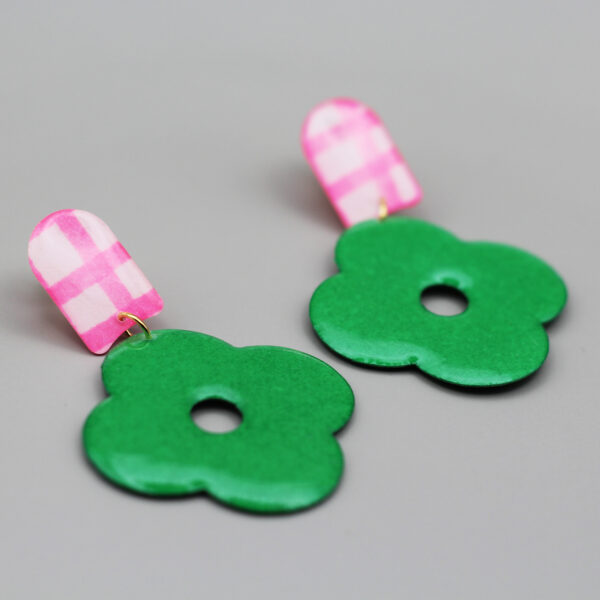 Boucles d’oreilles Clover vertes se composent d’un trèfle vert suspendu à une puce vichy rose pour un style frais et acidulé !