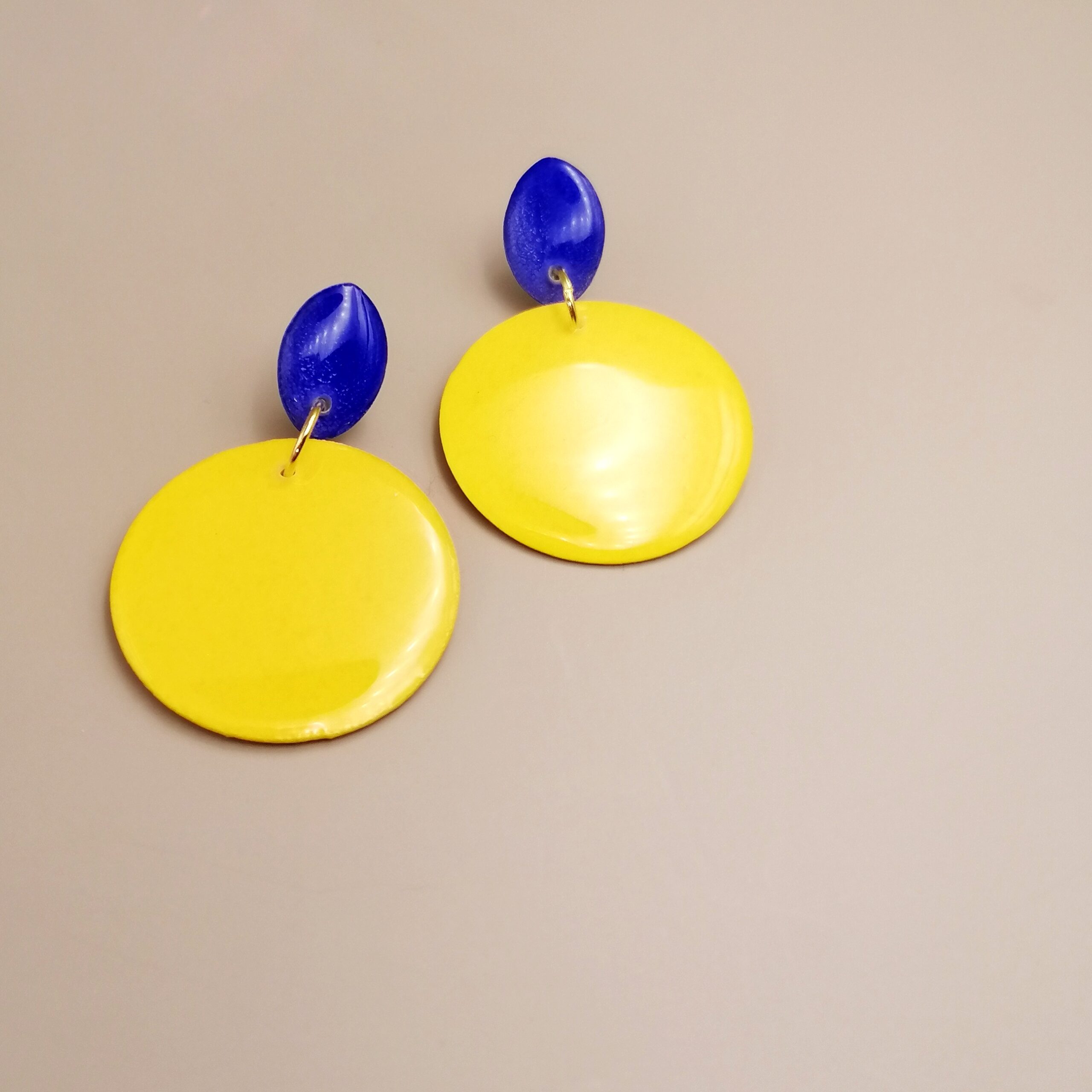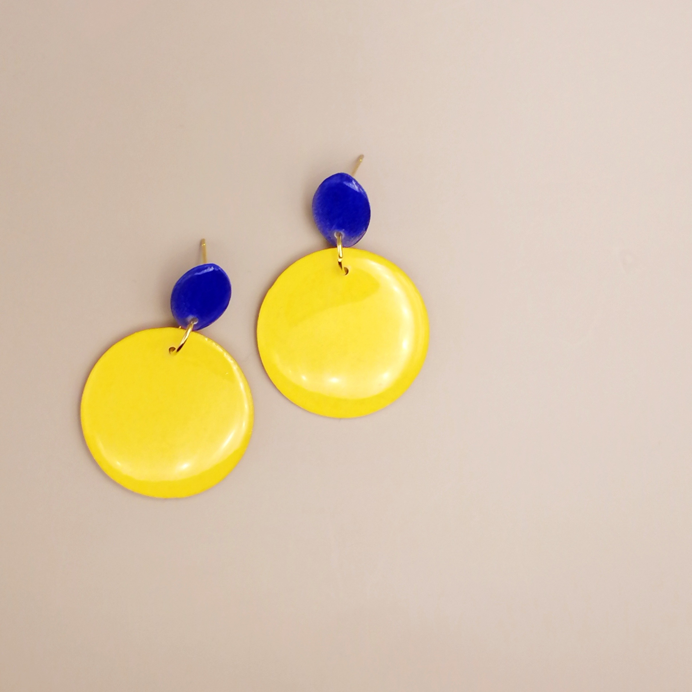 Dahab signifie Or. Les boucles d’oreilles Dahab de la série Shams, c’est un disque jaune comme de l’or chauffé au soleil, contrasté par une touche de bleu Majorelle, en forme d’ogive, comme un œil sacré. Dahab évoque la richesse de la lumière et la chaleur vibrante de Marrakech.