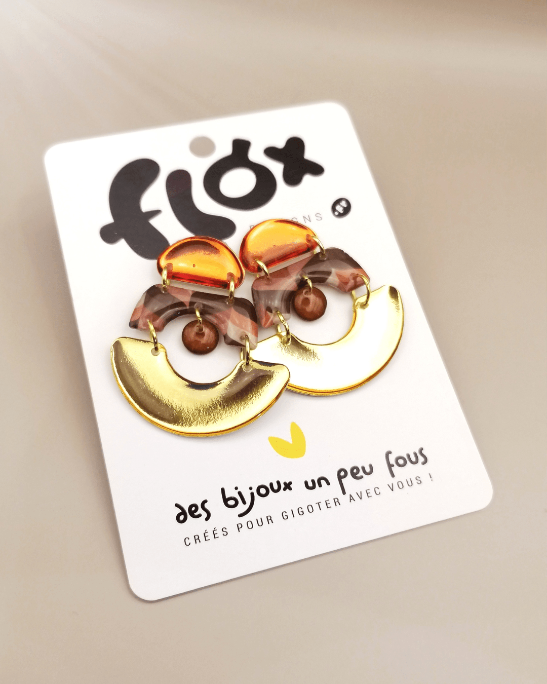 Montage sur clous dorés, assemblage en métal doré. Convient aux oreilles percées.