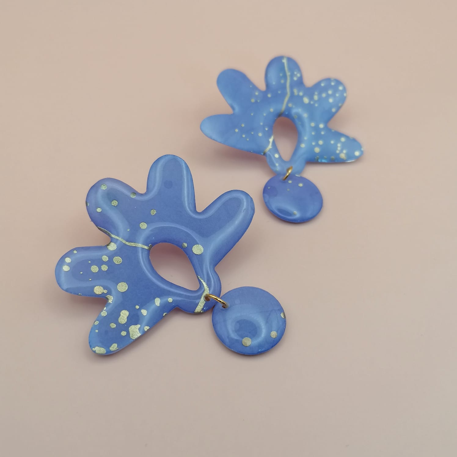 Boucles d’oreilles Flax Mauve 2 se composent d’un œillet stylisé mauve marbré or ajouré au centre et d’une puce ronde mutine et gesticulante pendue à ses basques !