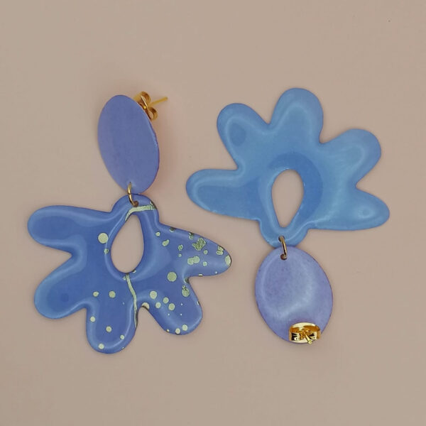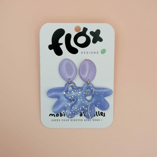 Boucles d’oreilles Flax Mauve se composent d’un œillet stylisé mauve marbré or ajouré au centre gesticulant sous une puce ronde à pois.