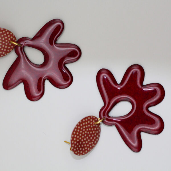 Boucles d’oreilles Flax se composent d’un œillet stylisé rouge foncé ajouré au centre, gesticulant sous une puce ronde à pois.