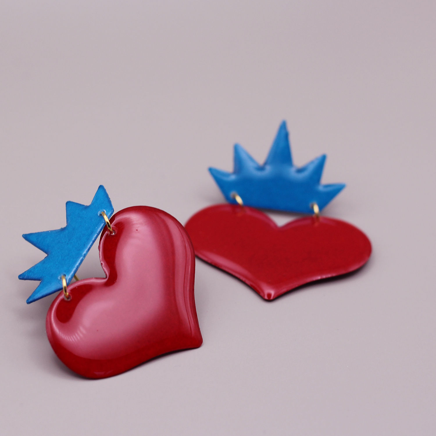 Boucles d’oreilles L’Amour couronné se composent d’un gros cœur rouge vif surmonté d’un couronne bleu céleste.