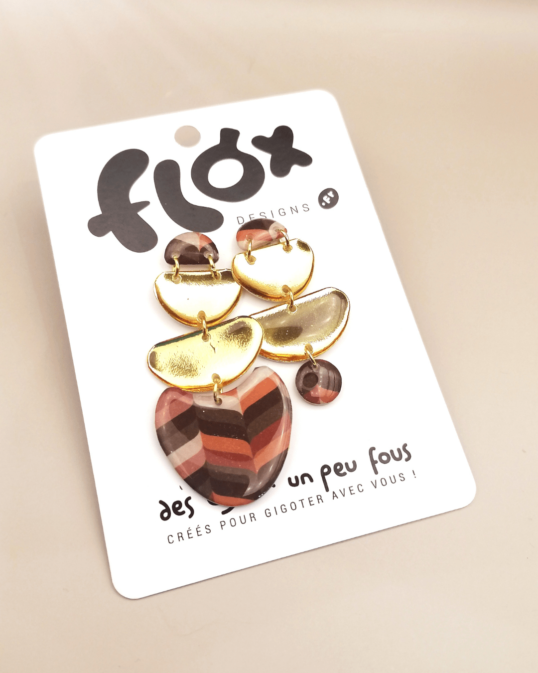 Asymétriques. Montage sur clous dorés, assemblage en métal doré. Convient aux oreilles percées.
